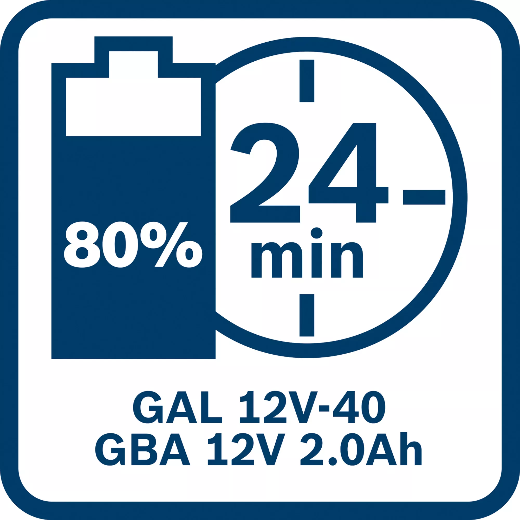 - GAL 12V-40: Rapid charging speed for all 12 V batteries. Charging 12V 2.0Ah batteries from 0 to 80% in 24 min.