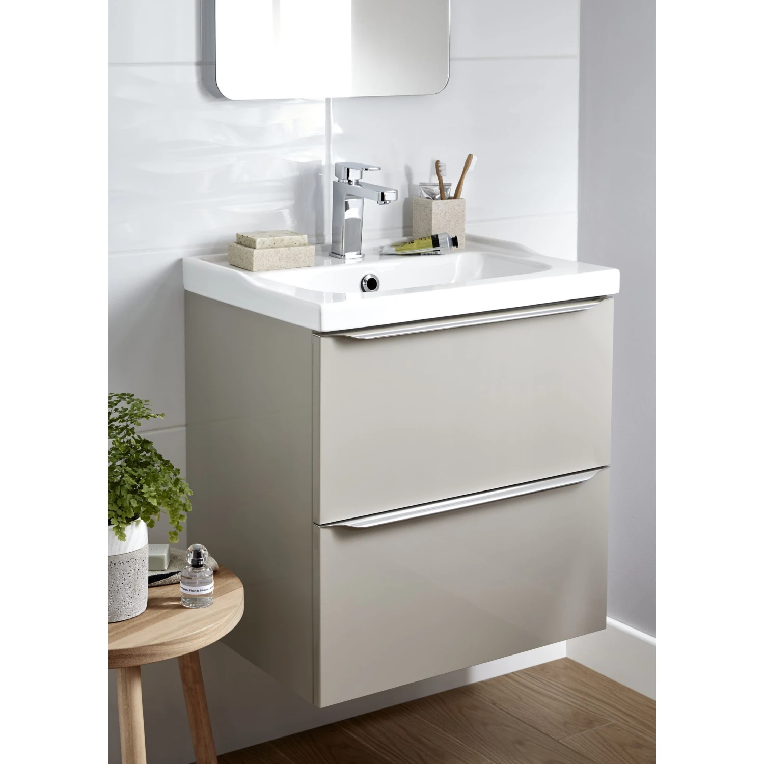 Bathrooms can be busy, cluttered spaces. So, we’ve designed the Imandra range – a smart modular furniture solution that fits any size, maximises storage and is built to last. This set comes with the Imandra vanity unit in Taupe and Lana basin.