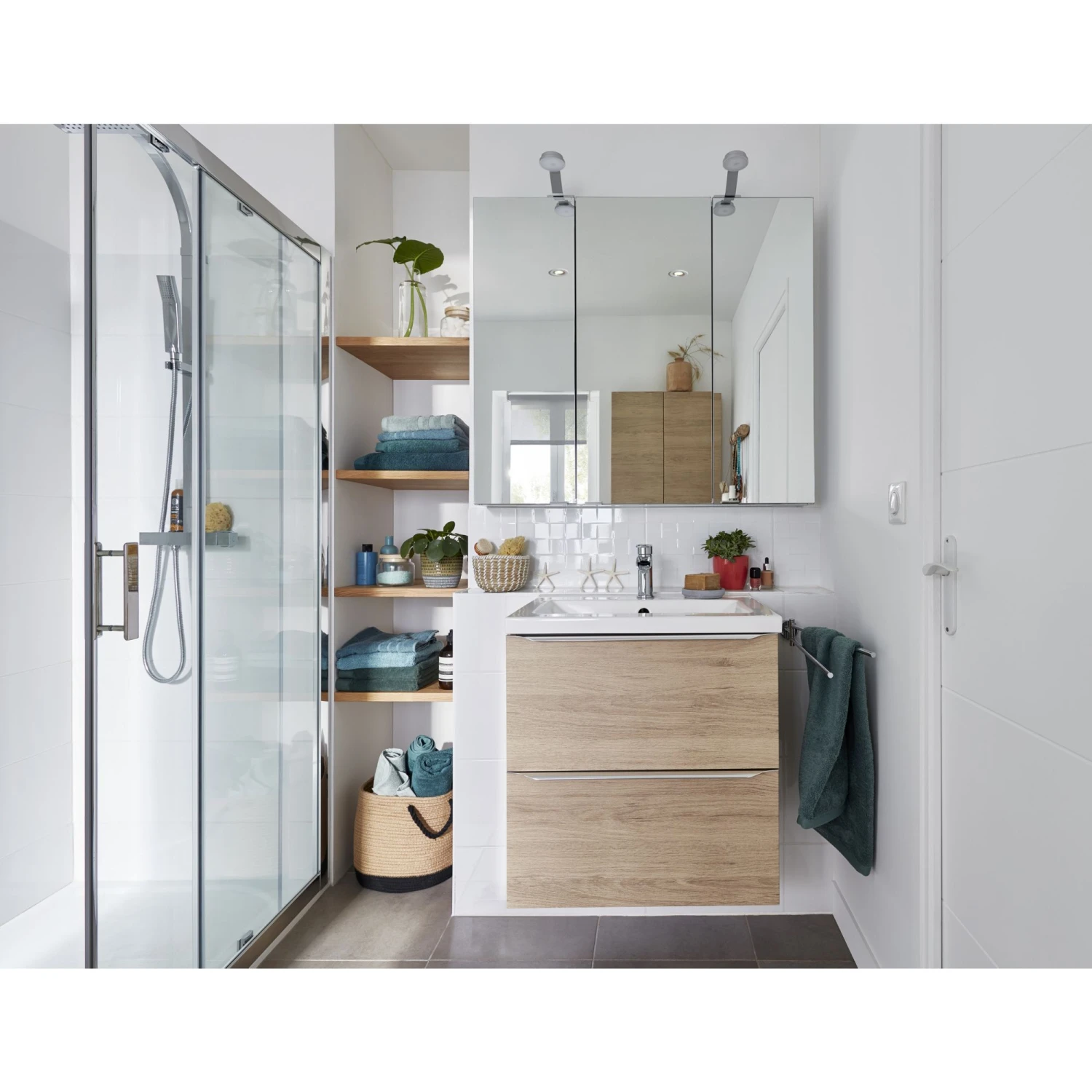 Bathrooms can be busy, cluttered spaces. So, we’ve designed the Imandra range – a smart modular furniture solution that fits any size, maximises storage and is built to last. This set comes with the oak effect Imandra vanity unit and Nira basin.