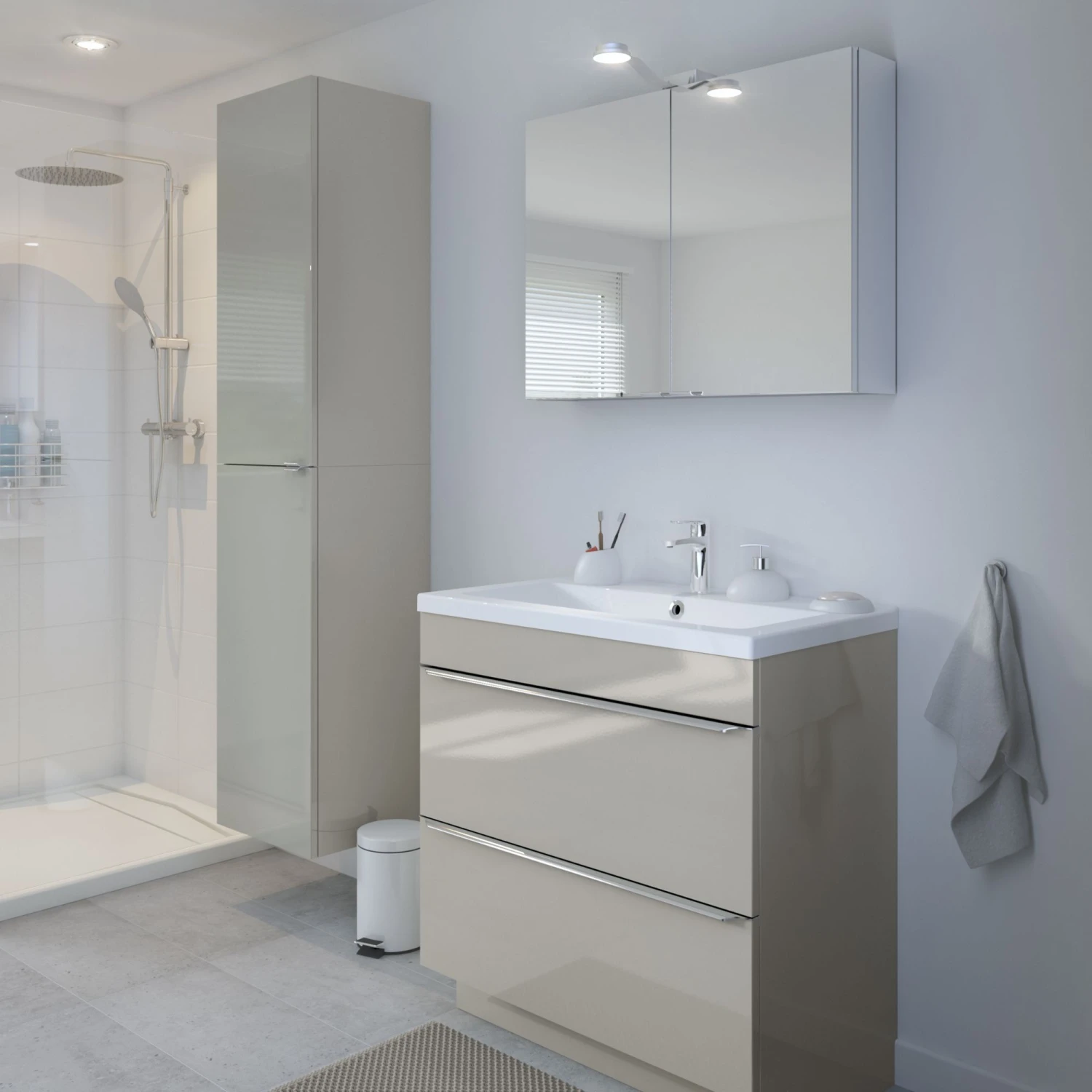 Bathrooms can be busy, cluttered spaces. So, we’ve designed the Imandra range – a smart modular furniture solution that fits any size, maximises storage and is built to last. This set comes with the Imandra vanity unit in Taupe and Nira basin.