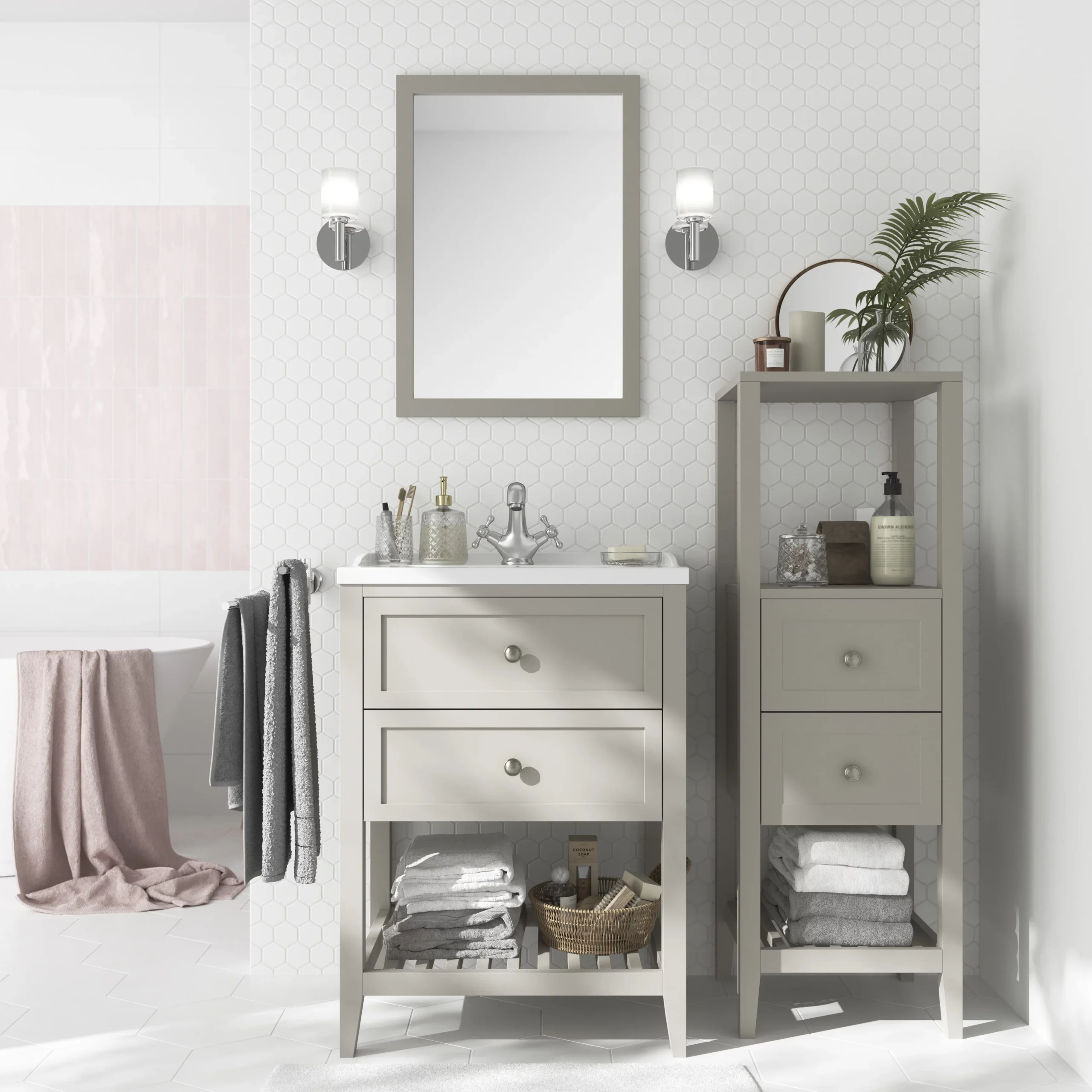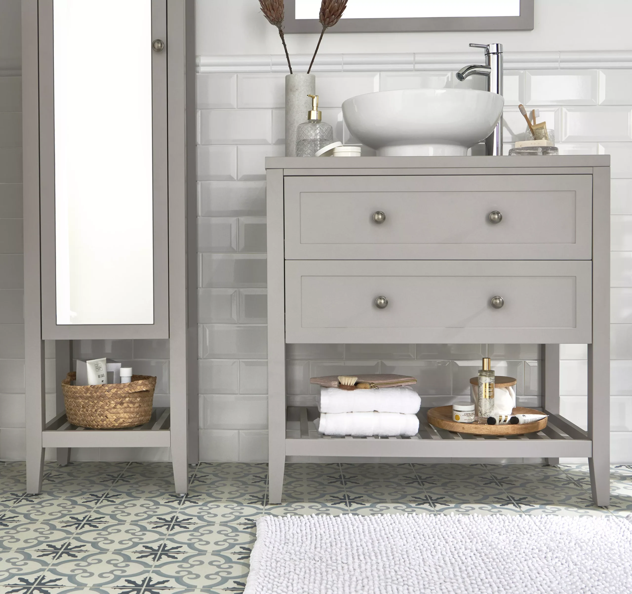 - Open shelf for items you want to see and keep within easy reach, such as towels