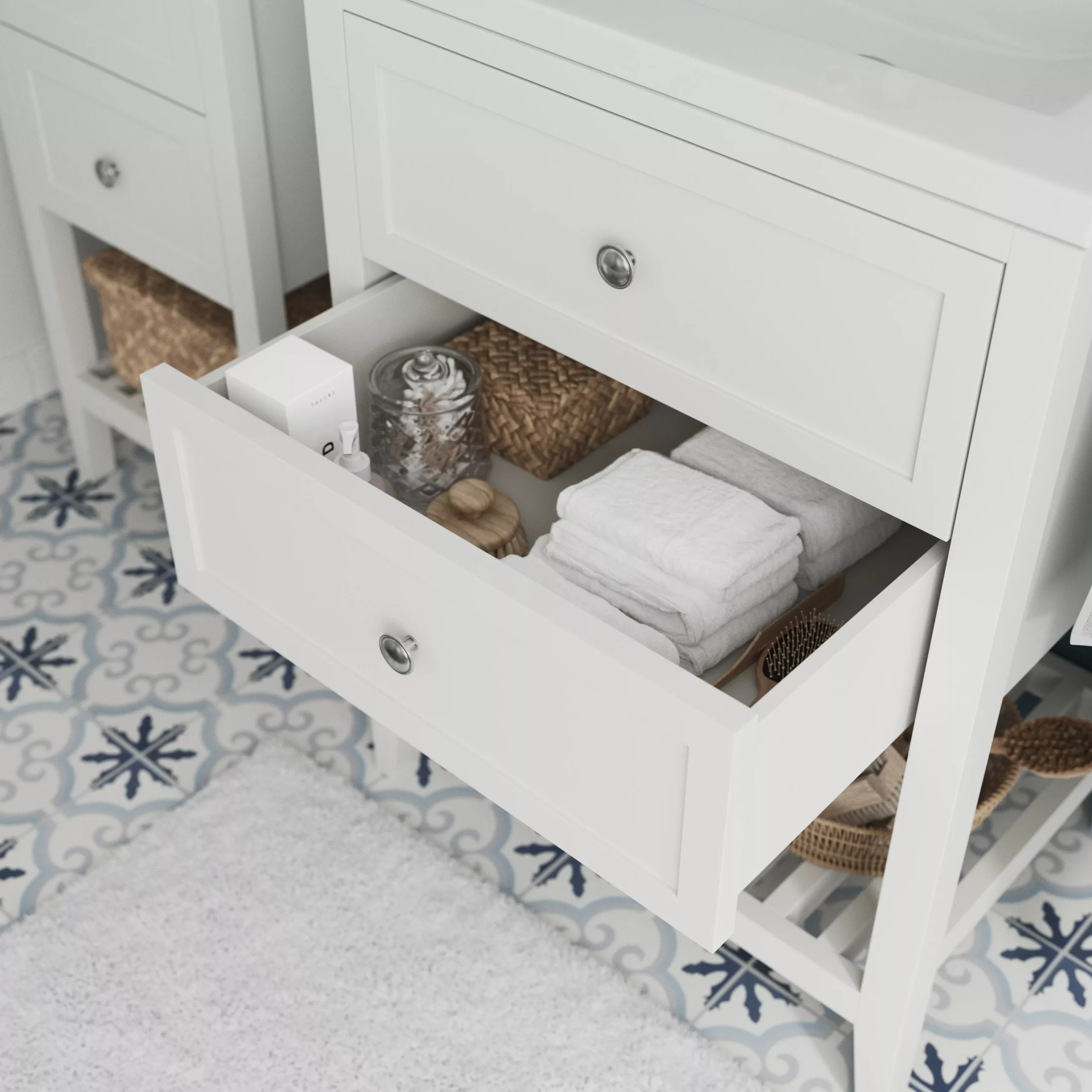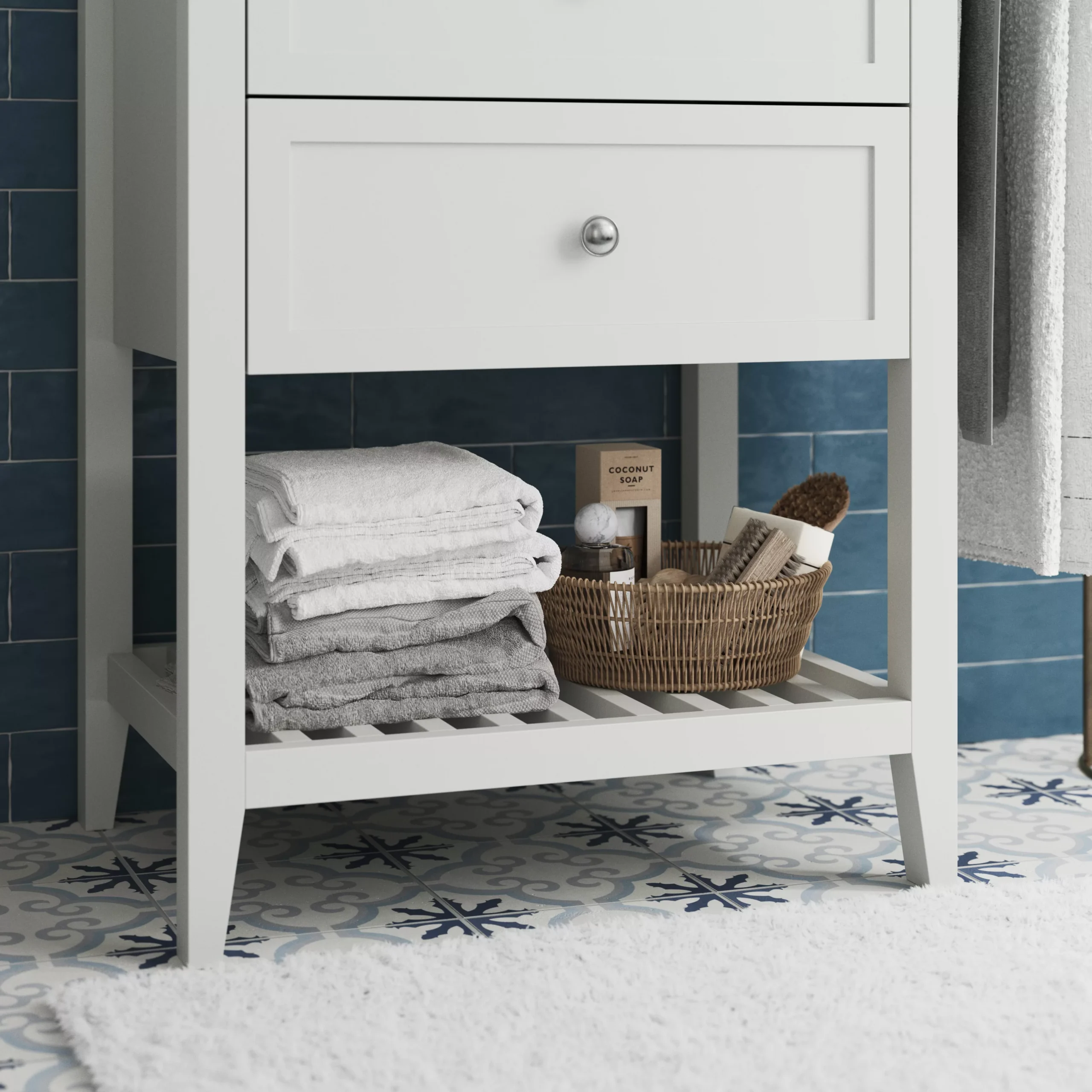 - Open shelf for items you want to see and keep within easy reach, such as towels